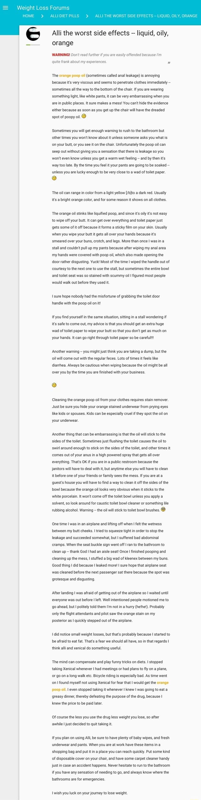 Get Alli Weight Loss Oily Stool Pictures. These are signs that the medicine is working properly. Changes in your bowel function because of the unabsorbed fat, fatty/oily stool, oily spotting in your undergarments, orange or brown colored oil in your stool, intestinal gas with discharge, loose stools, a feeling of needing to have a bowel movement right away,
